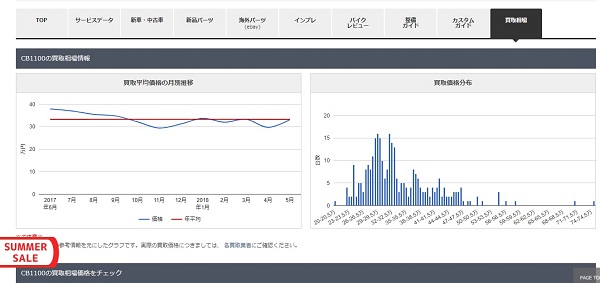 かなり価格に開きが有ります。最高値と最安値では54万円も違います。言うまでもなく、これはバイクの状態による差です。この表では走行距離別、年式別の統計は見れないので、参考程度にしておきましょう。中心価格帯が30~35万円ということが分かればいいでしょう。(この情報だけでも、価格交渉に使えると思いませんか?)