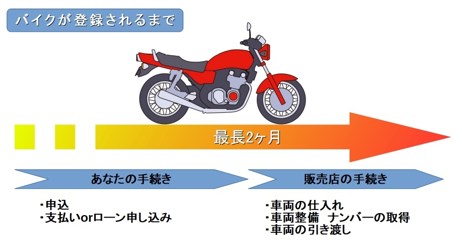 新車の場合、店舗には試乗用バイクしか無く、購入の申し込みを受けてから新車をメーカーから取り寄せるケースも珍しくありません。人気があるモデルやカラーの場合には、納品までに予想以上の期間がかかることもあります。