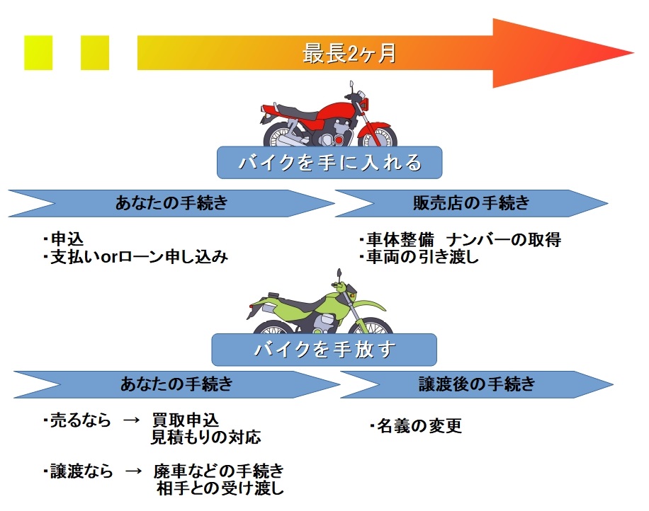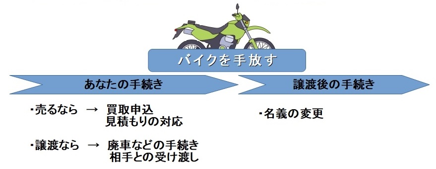 譲るのであれば、最低限の手続きとして、役所での廃車手続きが必要です。但し廃車されたバイクは公道で乗れなくなりますから、そのタイミングには注意が必要です。